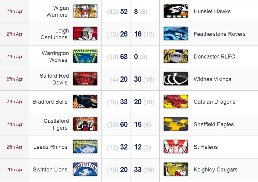 Dimanche (27/04), toutes les rencontres opposant une équipe de Super League à une de Championship ont, sans surprise, accouché d’une large victoire de la formation de l’élite. De leur côté, le leader du Championship, Leigh, est parvenu à venir à bout d’une valeureuse formation de Featherstone, au terme d’un match serré. Autre match entre franchises du même niveau, Super League cette fois, les Vikings se sont imposés à Salford. Enfin, les Dragons Catalans se sont inclinés sur le terrain de Bradford. Les Sang et Or ont pourtant débuté cette rencontre idéalement en menant 16-0 au bout de 13 minutes. Mais ils ont ensuite connu un passage à vide, couplé à la rébellion des Bulls, et encaissent 3 essais. Euphoriques, les locaux ont continué sur leur lancée tandis que les Dracs ont perdu leurs moyens et commis trop de fautes. Ils perdent finalement 33-20 et sont privés d’une troisième qualification consécutive pour les quarts de Finales de la Challenge Cup.