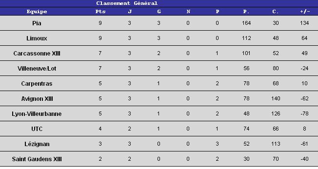 Limoux et Pia continuent sur leur lancée en s’imposant ce week-end, respectivement à Carpentras et contre Lyon Villeurbanne. Quant à Lézignan et St Gaudens, ils continuent leur série noire et ne comptabilisent toujours aucune victoire dans ce championnat.