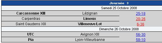 Carcassonne s’est bien relevé de sa défaite du week-end dernier et s’est imposé ce week-end à domicile contre Lézignan. Villeneuve sur Lot enchaîne deux victoires consécutives en s’imposant face à St Gaudens et accède ainsi à la quatrième place au classement.
