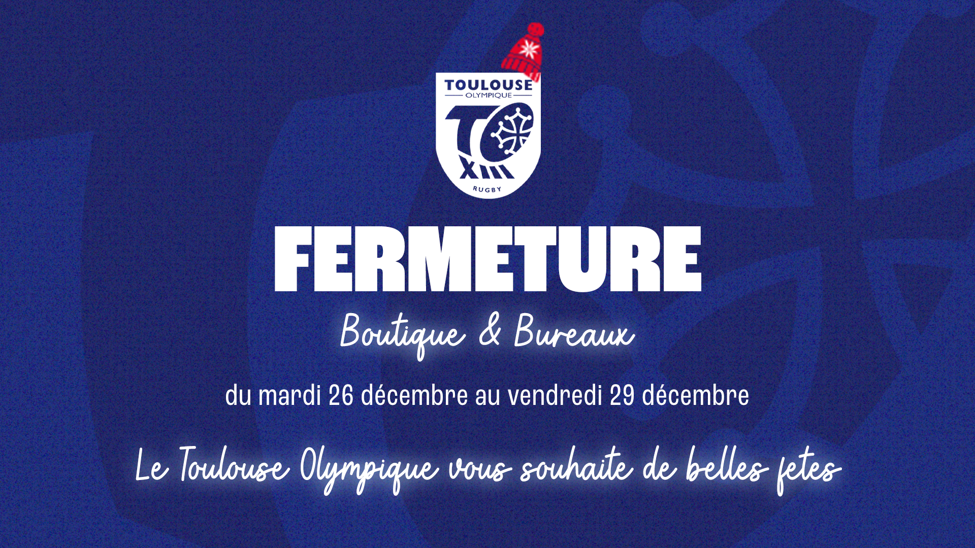 La boutique et les bureaux du TO à Ernest Wallon seront fermés du mardi 26 au vendredi 29 décembre. Nous vous souhaitons de bonnes fêtes de fin d’année et nous vous donnons rendez-vous en 2024 ! 💙 🤍