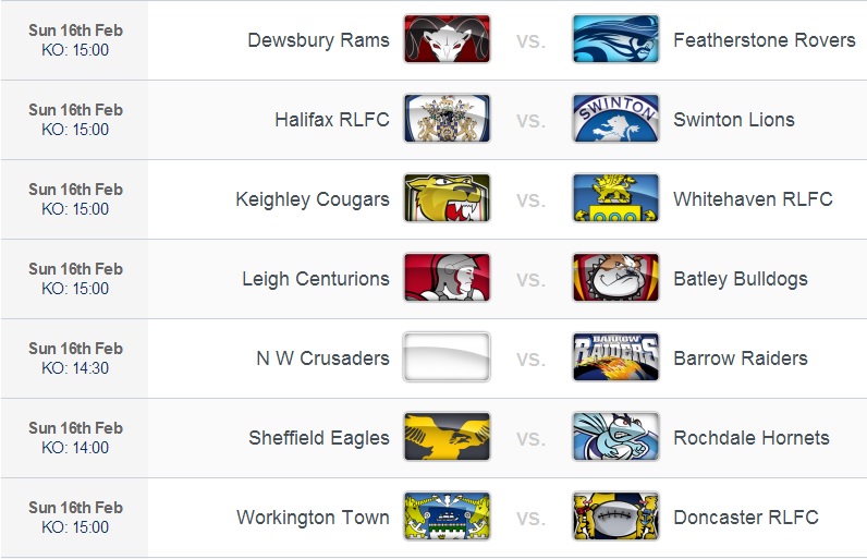 Pas de match prévu ce samedi, les quatre rencontres restantes se jouant dimanche (16/02) à 15h (heure locale). D’abord, les Vikings accueilleront les London Broncos. Ce sera l’occasion de constater si le groupe londonien, considérablement modifié durant l’inter-saison, a déjà acquis les automatismes nécessaires à ce niveau. Cette même question se posera pour l’équipe de Salford, qui recevra les Wildcats. Les joueurs de Richard AGAR tenteront néanmoins de faire un coup pour ce premier match à l’extérieur. Ensuite, les Tigers auront de quoi faire avec un déplacement compliqué à Bradford.