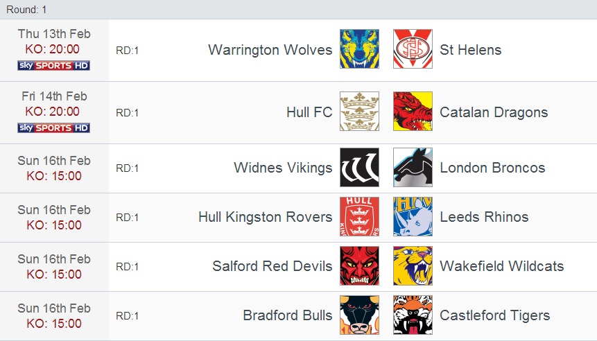 Ce soir (jeudi 13/02) une opposition alléchante est proposée entre les Warrington Wolves et les St Helens Saints. Les finalistes de la dernière finale feront en sorte de réussir leurs débuts à domicile mais devront néanmoins se méfier des Saints, capables d’inquiéter n’importe qui s’ils s’en donnent les moyens.