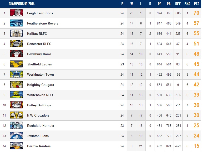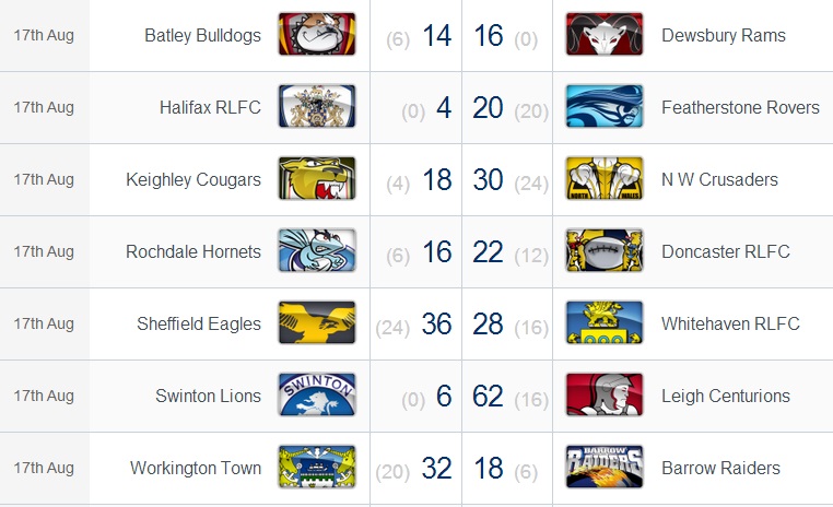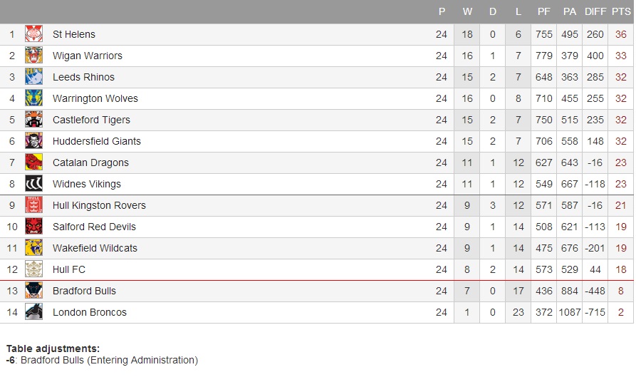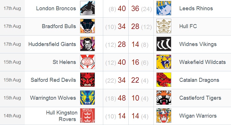 Les Dragons s’inclinent sur le terrain de Salford, mais parviennent à conserver leur 7ème place au classement. En effet, Widnes (8ème) s’est logiquement incliné à Huddersfield, et les coéquipiers de Kevin LARROYER (Hull KR – 9ème) se sont faits rejoindre par les Warriors dans les derniers instants du match. Ce match nul permet à Wigan d’être seul en 2ème position mais laisse s’échapper Saint Helens, large vainqueur de Wakefield à Langtree Park.