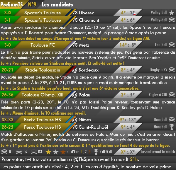 A vous de rédiger simplement un tweet commençant par « @TlsSports #PodiumTS » et de donner ensuite les trois équipes qui méritent selon vous d’être sur le podium : 1er TO, 2e …, 3e…. Attention, seuls les podiums complets seront comptabilisés et la clôture des votes est fixée pour demain (11/11) 21 heures. A vous de voter rapidement !